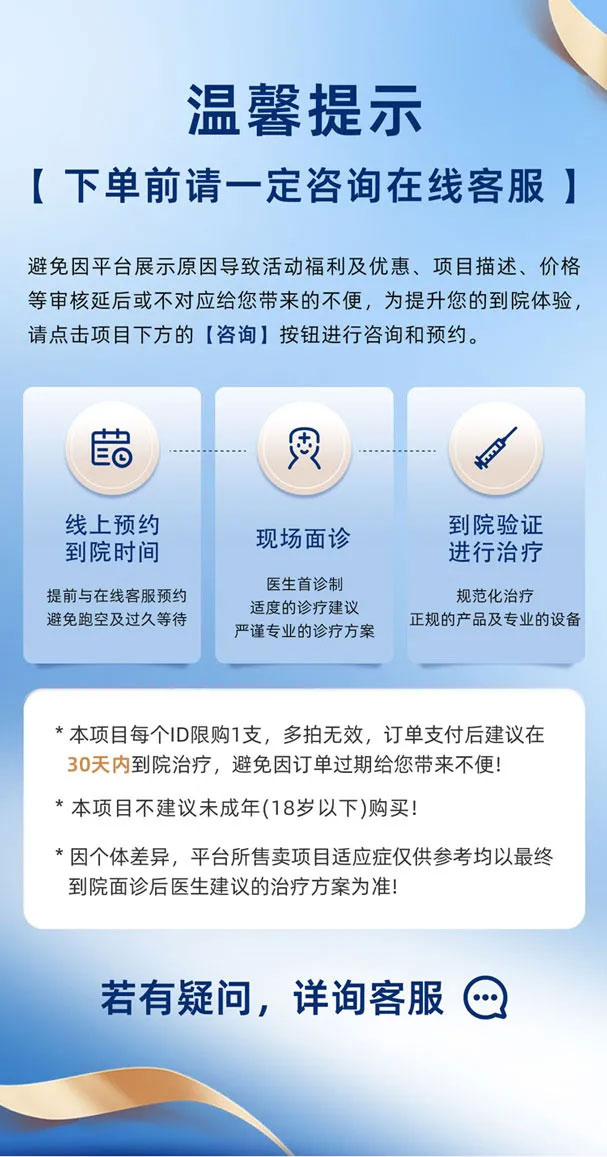 5、亲爱的顾客,为响应国家《医疗广告管理法》《中华人民共和国广告法》关于医疗行业的相关规定,本院各类项目、服务、案例以及详情页等将不完全展示,如果您对项目等有任何疑问,请咨询在线客服了解!谢谢您的理解与支持!
