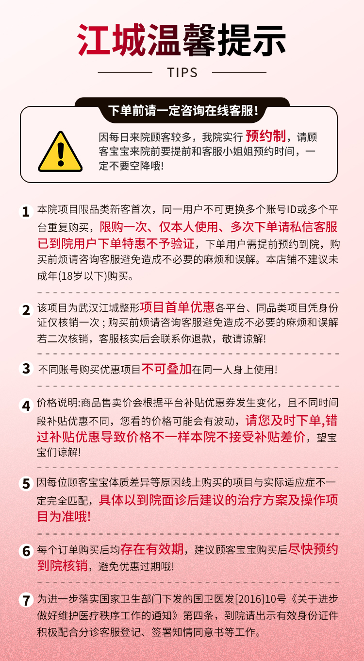 【温馨提示】1.此项目价格为更美特惠价,仅限购买一次,整形项目费用不包含麻醉费、检查费、住院费等(特殊标注除外,详情请咨询客服)。2.没有任何隐形消费,任何收费项目均会提前告知。3.为避免高峰期的等待时间,预付后请提前私信预约。4.平台展示的价格为新客预约享受,如非平台预约,用户直接下单,机构有最终解释权。